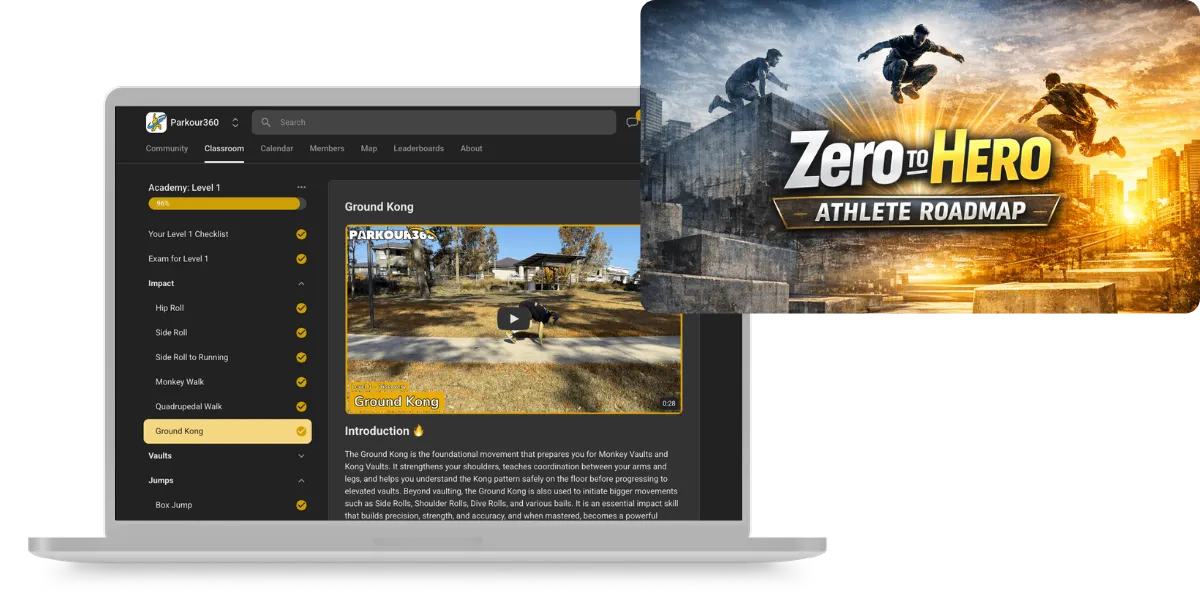 Not at all. Parkour360 is built around structured progression. You start with foundations like landing, rolling, vault mechanics and strength standards before moving to advanced skills. You train in the right order from day one.